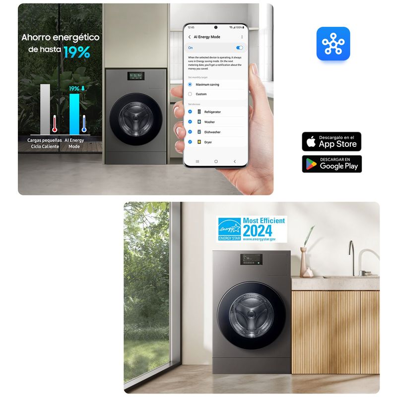 El modo de energía AI permite monitorear y reducir el consumo eléctrico. En ciertos ciclos, reduce el uso de energía en más del 19% manteniendo el mismo rendimiento, disminuyendo el uso del calentador y aumentando el tiempo del ciclo.