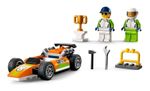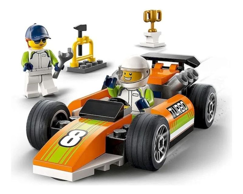¿Qué hay en la caja? - Todo lo que los niños necesitan para crear un coche de carreras de juguete, además de un trofeo de ganador, herramientas y minifiguras de conductor y mecánico.
