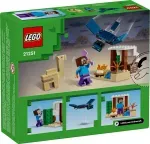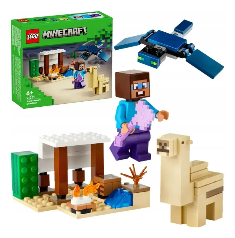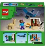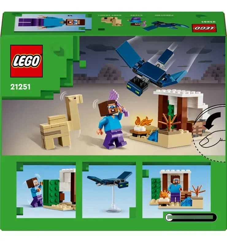 Este regalo para niños y niñas de 6 años o más, reconfigurable y basado en el juego de interpretación, contiene 3 figuras LEGO Minecraft (entre ellas Steve) y una cabaña Minecraft en el bioma Desierto. El set cuenta con icónicos objetos Minecraft, como una mesa de trabajo, una fogata y elementos típicos de un paisaje desértico. Sensacional para fans de Minecraft, inspirará creativas aventuras y emocionantes batallas contra un fantasma volador con alas móviles que ataca la base. Steve tiene una expresión facial actualizada y, por primera vez en un set LEGO Minecraft, hay un camello bebé. Es compatible con otros juegos LEGO Minecraft