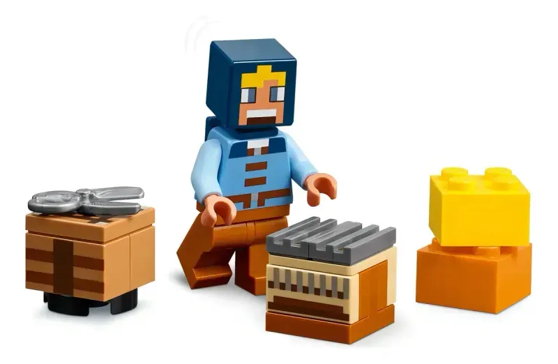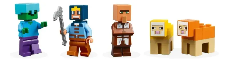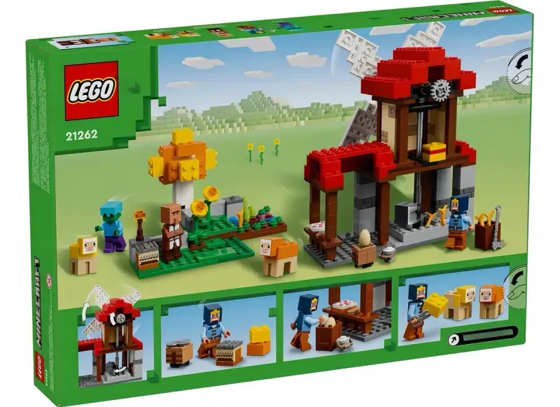 Este juguete de construcción incluye un molino LEGO que funciona girando una rueda situada en la parte trasera. Cuando se mueven sus aspas, la muela “convierte” el trigo en harina. Hay huevos, leche y azúcar para hornear pan y un pastel. La parte superior del molino cuenta con espacio para almacenar heno y otros suministros. También trae una figura de un molinero y un aldeano pastor, que trasquila la oveja Minecraft amarilla y naranja. Descubre el telar y usa la lana sobrante para decorar el árbol. En el huerto, los niños pueden cultivar trigo, caña de azúcar y remolacha. Mientras tanto, ¡un zombi al acecho espera para atacar!