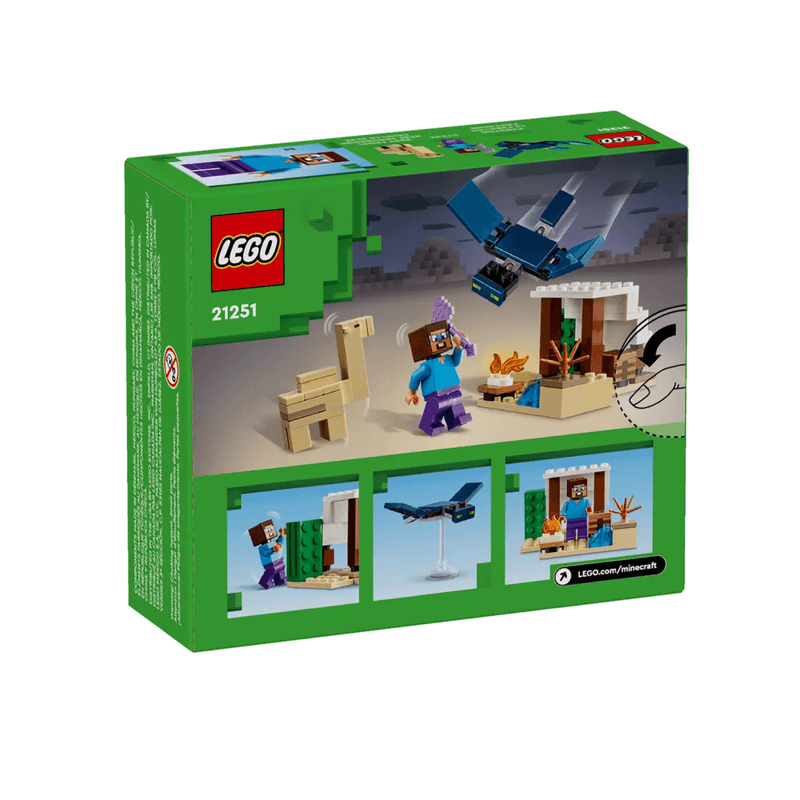 Contiene 75 piezas. Incluye 3 figuras Lego Minecraft (entre ellas Steve) y una cabaña Minecraft en el bioma Desierto. El set cuenta con una mesa de trabajo, una fogata y elementos típicos de un paisaje desértico.