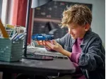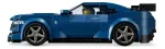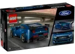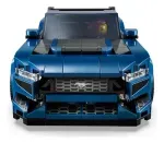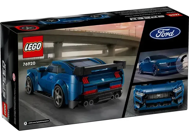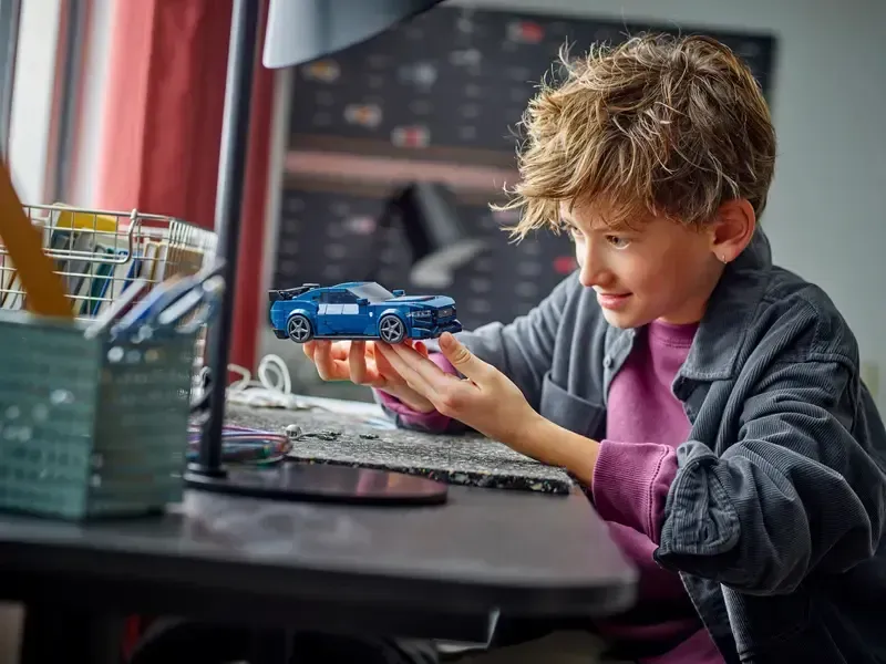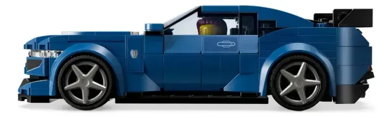El coche LEGO construible viene con techo desmontable y una minifigura de una piloto con una sudadera que lleva “Mustang Black Horse” impreso.