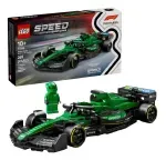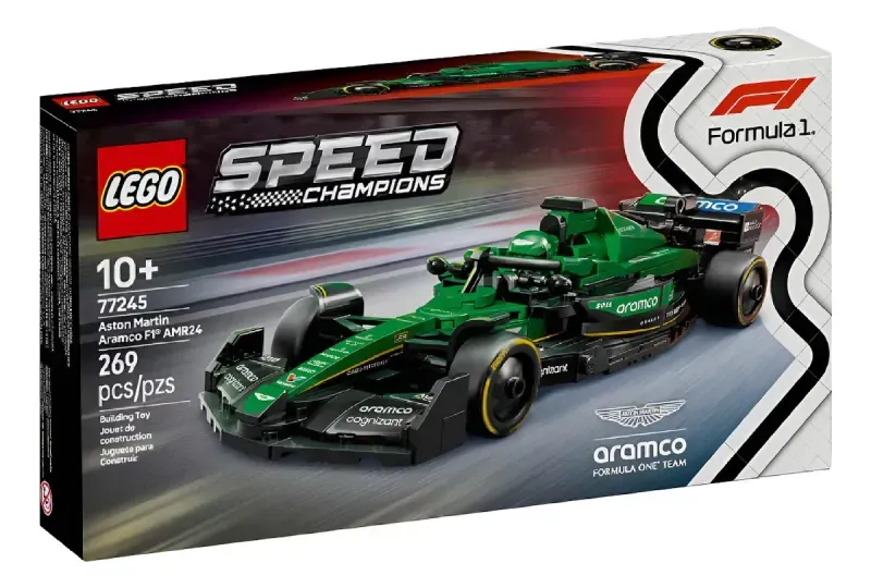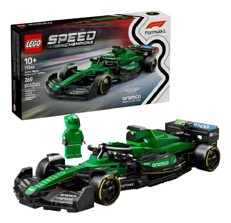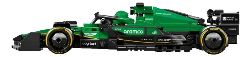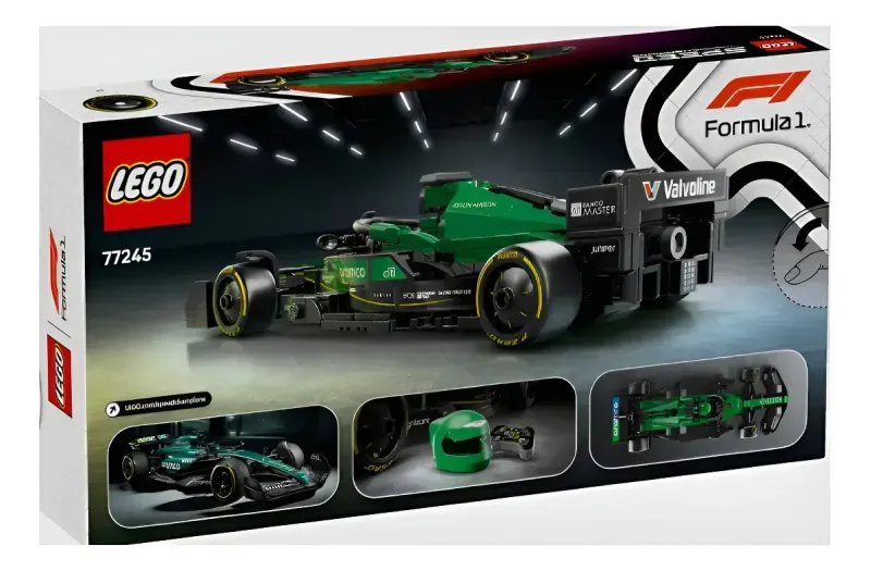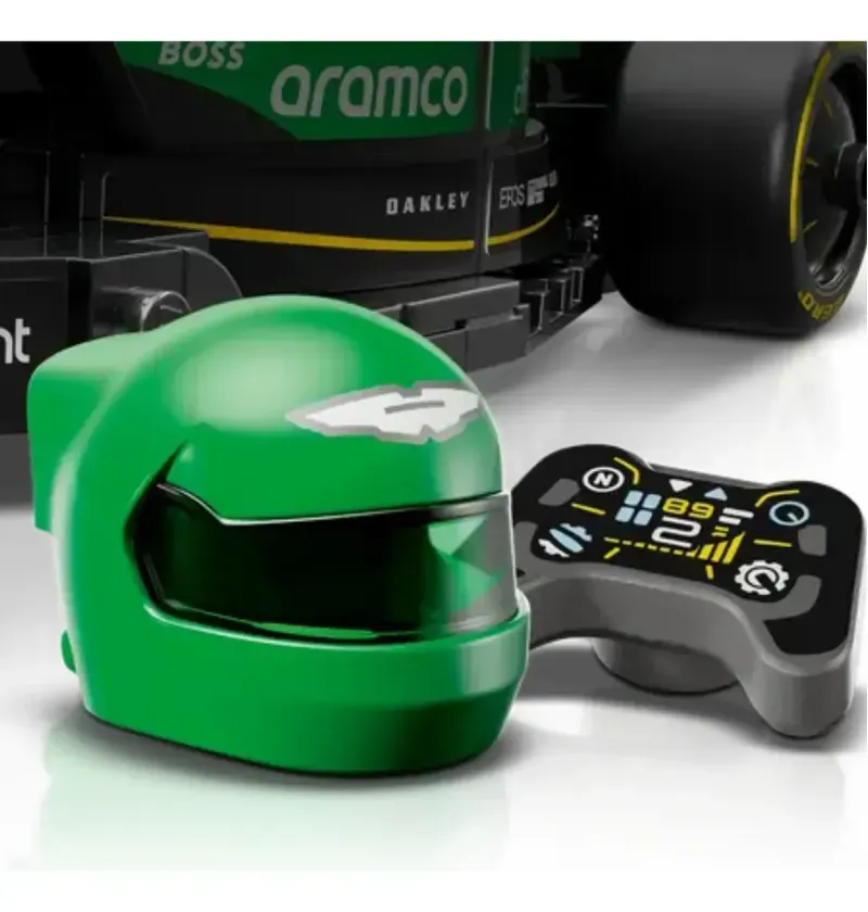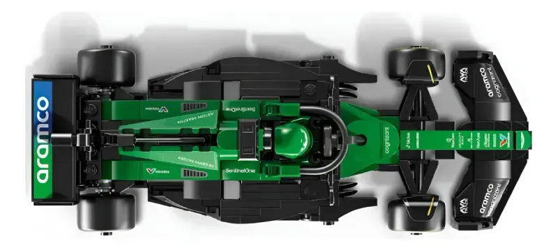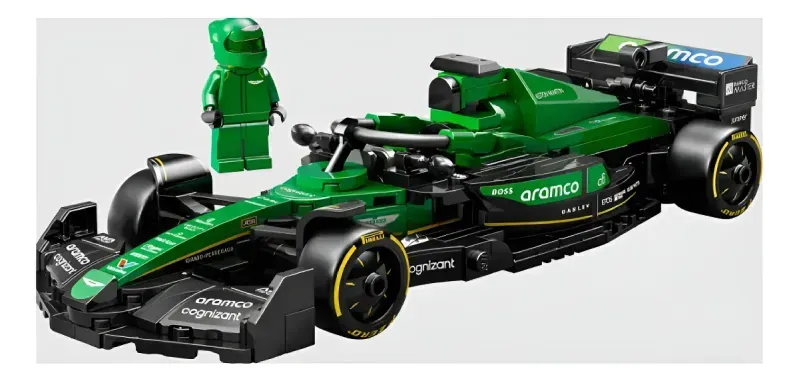 Viene con una minifigura de un piloto con traje de competición del equipo Aston Martin Aramco F1 Team y casco con alas.