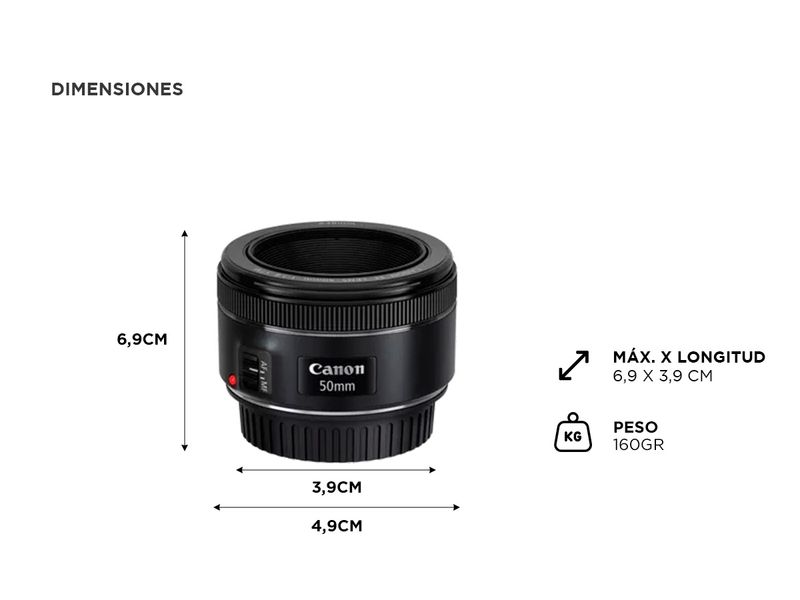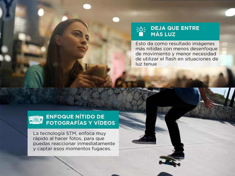 Con solo 160 gramos, es lo suficientemente liviano para llevar a cualquier lugar y utilizar en sesiones largas sin esfuerzo. Además, su motor de enfoque STM garantiza un enfoque rápido y casi silencioso, especialmente útil para grabación de video y captura de escenas en movimiento sin ruido adicional.