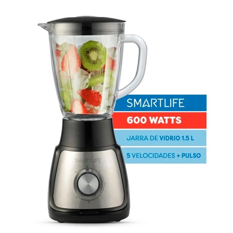 Cuchillas inoxidables desmontables + 600W de Potencia: Cuenta con 5 velocidades para triturar la fruta o verdura y si se desea acelerar el proceso de licuado, girando la perilla a pulso se llegará a la potencia máxima en cuestión de segundos. Jarra de Vidrio: Diseñada para simplificar tu vida, está fabricada con jarra de vidrio que le dará larga vida al electrodoméstico. No se decolora, ni se raya, no absorbe olores ni daña a la comida. Terminaciones en Acero Inoxidable: Para realzar la elegancia del artefacto y que sea altamente durable, la Licuadora SL-BL1055PN posee terminaciones de acero inoxidable. 2 años de Garantía: Todos los pequeños electrodomésticos de cocina Smartlife poseen 2 años de garantía oficial. ESPECIFICACIONES: Color Negro - Silver Potencia 600 W Velocidades 5 Es apto para picar hielo Sí Capacidad en volumen 1.5 L Materiales del cuerpo Plástico - detalles inox Voltaje 220 V Material de la jarra Vidrio Con función pulsar Si Es industrial No Con cuchilla removible Si Con cuchilla de acero inoxidable Si Con tapa dosificadora Si Con pico vertedor Si Con cierre de seguridad Si Con jarra resistente al calor Si Medidas con caja (Lon x An x Al) 22 x 19 x 39 cm Peso con caja 3.39 kg Manual de Instrucciones Si