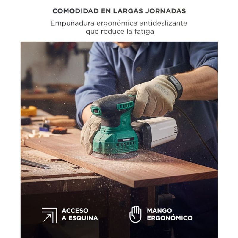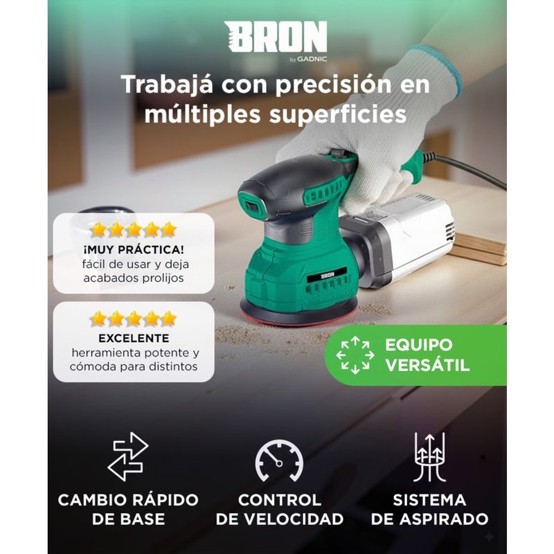 Control preciso en cada superficie: regulá la velocidad según el material, desde madera delicada hasta desbaste intenso.