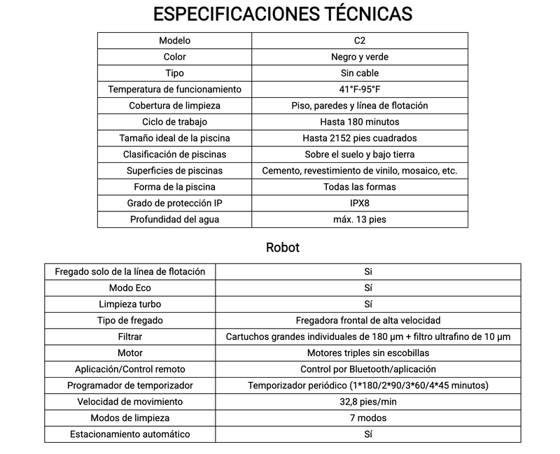 Limpieza de Cobertura Total: Limpia suelos, paredes y líneas de agua hasta 200 m² con un tiempo de funcionamiento de 180 minutos en Modo Eco. Compatibilidad Multisuperficie: Funciona de forma segura en azulejos, concreto, vinilo y fibra de vidrio. Filtración Ultrafina de Doble Capa: Combina cartuchos de 180µm para partículas grandes y filtros ultrafinos de 10µm para capturar desde hojas hasta polvo fino.7 Modos de Limpieza + 6 Rutas: Elige entre modos de limpieza Completa/Suelo/Pared/Solo línea de agua/Pared y luego suelo/Turbo/Eco y personaliza las rutas a través de la App WYBOT. Programación en la App: Programa hasta 4 limpiezas por semana para un mantenimiento sin esfuerzo.Sistema de Auto-Estacionamiento: Regresa automáticamente al borde de la piscina para una fácil extracción.Motor sin Escobillas + Diseño Inalámbrico: Ofrece un rendimiento potente y duradero mientras evita enredos de cables. Cobertura de limpieza completa Limpieza integral-suelos, paredes, línea de flotación, escalones y pendientes. Limpieza sin esfuerzo El WYBOT C2 ofrece una limpieza sin esfuerzo gracias a su potente motor sin escobillas mejorado, capaz de generar un impresionante caudal de agua de 3592 GPH. Su sistema de filtración de doble capa garantiza una limpieza profunda, mientras que su capacidad mejorada para sortear obstáculos permite una navegación fluida por la piscina.