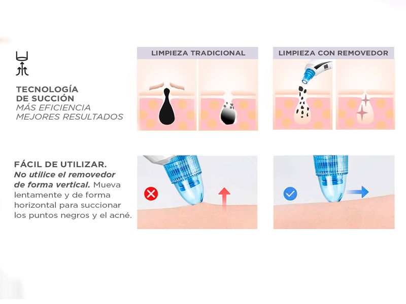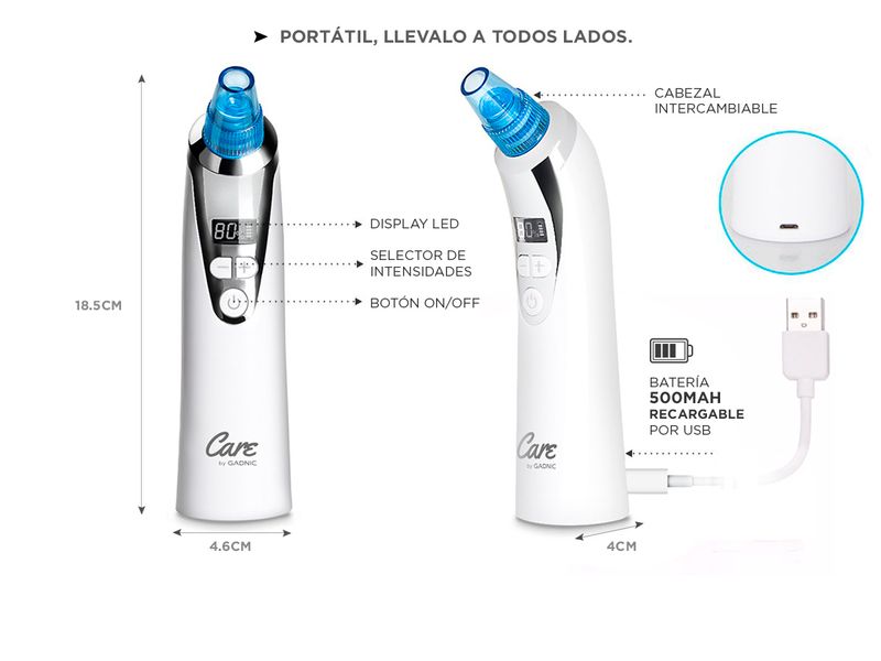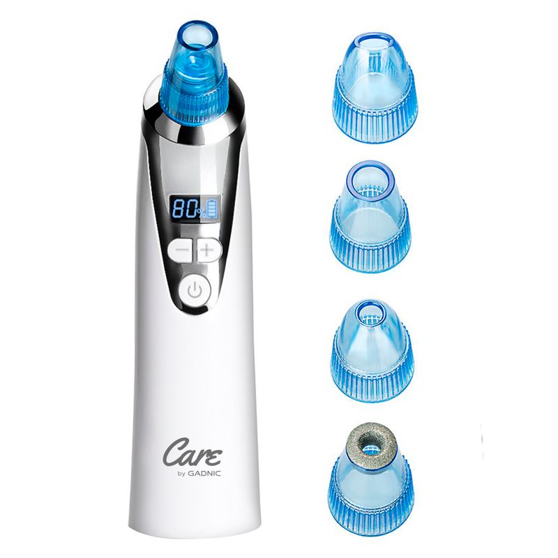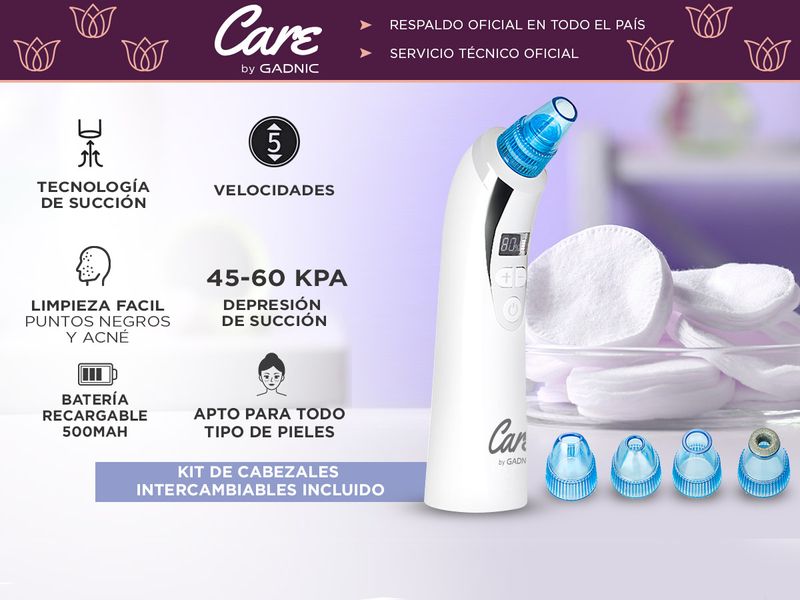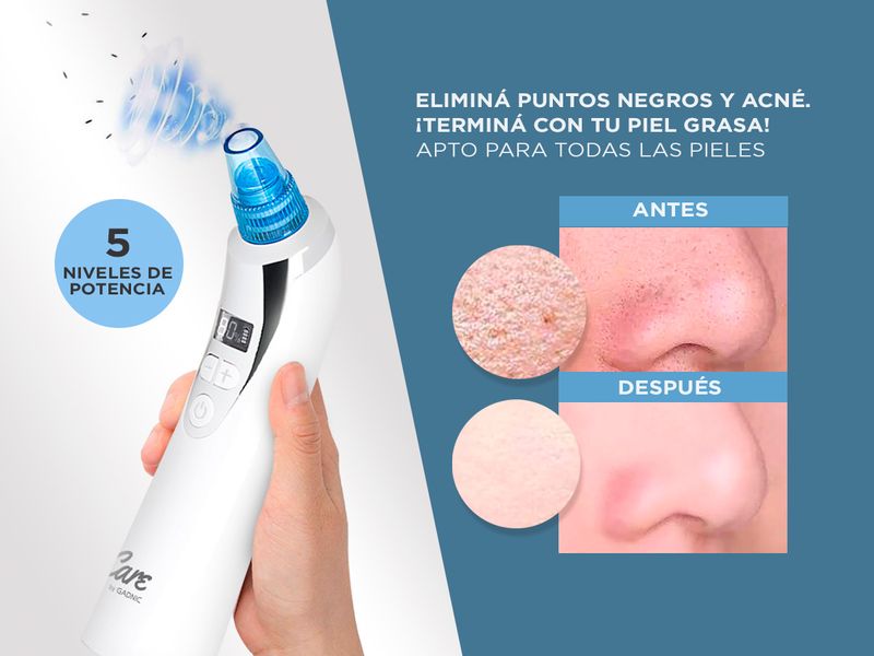 ¡Gadnic presenta su nueva línea de removedores de puntos negros! Se puede usar para eliminar profundamente los puntos negros, el acné y limpiar la cara. Es adecuado para el tratamiento de la piel seca, la piel flácida, la Piel opaca y también las arrugas. ¡Aumenta la irrigación sanguinea en tu piel! La función de vacío limpia los poros sucios a través de la succión y aumenta la circulación sanguínea en la piel. Viene con 5 cabezales de belleza cambiables, que pueden ofrecer diferentes funciones y ofrecer una limpieza más profunda para su piel facial La succión ajustable de muchos niveles lo hace adecuado para diferentes pieles, lo que lo hace el más versatil del mercado.