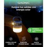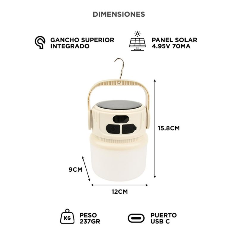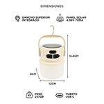 Cargá la lámpara en exteriores con su panel de 4.95V. Luz roja indica carga activa.