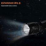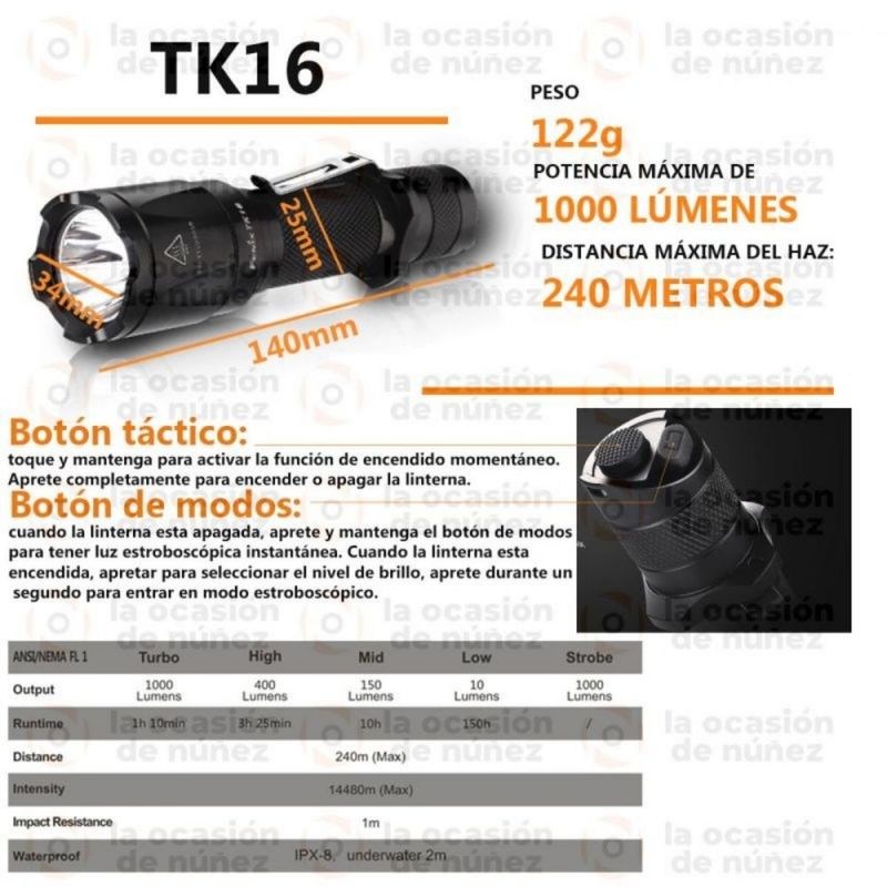 La linterna en todos sus modos alcanza 240m de distancia y 14480cd de intensidad; tiene una resistencia al impacto de 1m y se puede sumergir hasta 2m
