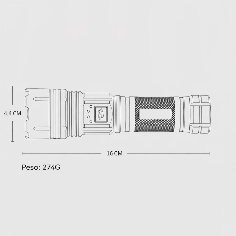 Iluminación potente, autonomía extendida y función power bank en una sola linterna táctica preparada para acompañarte en cualquier desafío.