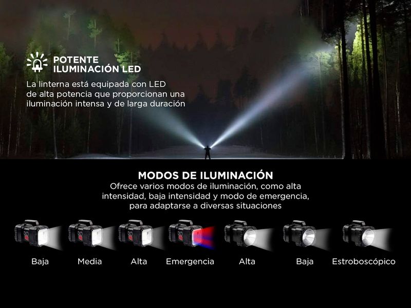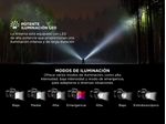 Modos de iluminación: Ofrece varios modos de iluminación, como alta intensidad, baja intensidad y modo de emergencia, para adaptarse a diversas situaciones.