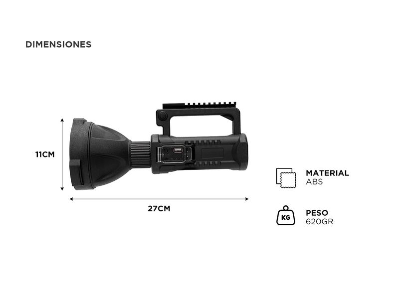 La linterna es recargable con cable micro usb, teniendo un tiempo estimado de uso de 4 a 6 horas y 8-10 horas de carga. Su pantalla indicadora te mantendrá alerta a su nivel de batería.