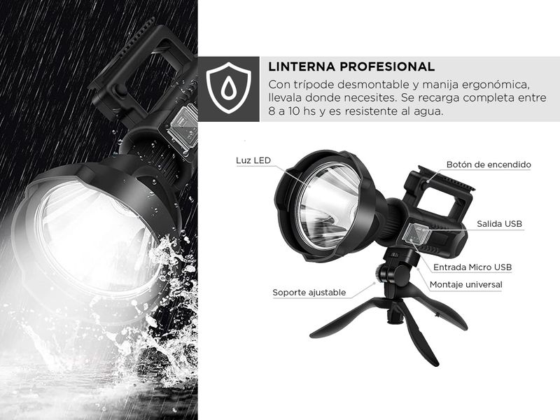 En esta oportunidad te presentamos una linterna profesional súper potente. Viene con un trípode desmontable incluido, además de una manija de agarre ergonómico.