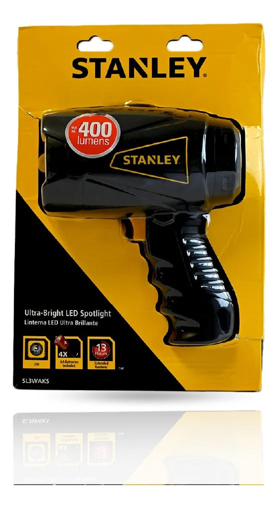La linterna Stanley LED inalámbrica de 3W, que funciona con 4 pilas AA (no incluye ) , ofrece hasta 400 lúmenes de brillo, con hasta 13 horas de autonomía, una carcasa resistente con bisel de goma y un bloqueo de gatillo de 3 posiciones,