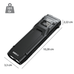 Diseño: Su estructura compacta y plana es más cómoda de llevar en el bolsillo que las linternas redondas convencionales, ocupando menos espacio y evitando molestias. El cuerpo está fabricado con un armazón de polímero reforzado con fibra de carbono y tapas de acero con revestimiento de titanio, lo que le da una gran robustez.