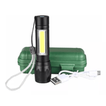 Pequeño tamaño y peso ligero, con una cuerda para facilitar su transporte. Material: aleación de aluminio.600 lumens con Zoom.Led delantero XPE.Led COB lateral excelente potencia.Alcance aprox. 100mts. Medida: 9cm. Tres funciones:LED DELANTERO: iluminación al 100% + Flash-Led COB lateral. Correa para muñeca.Se recarga por puerto Micro USB. Botón de encendido trasero.Incluye estuche plástico de excelente calidad.