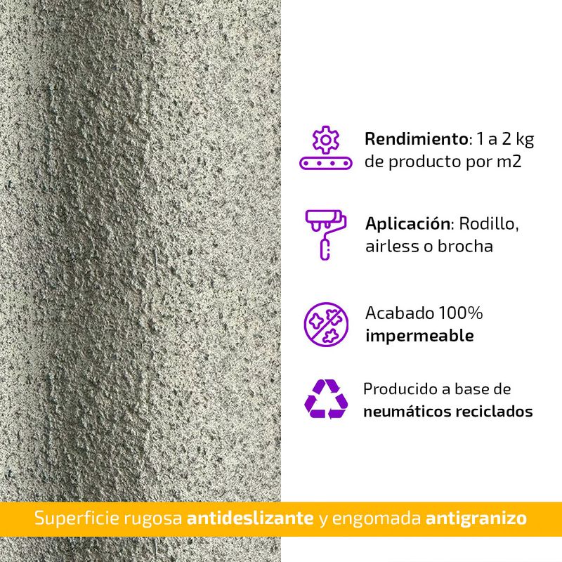 CAUCHOGOMA es un IMPERMEABILIZANTE de alto espesor compuesto por polímeros de caucho microtriturado a partir del reciclado de neumáticos y formulado a base de resinas acrílicas y poliuretano.