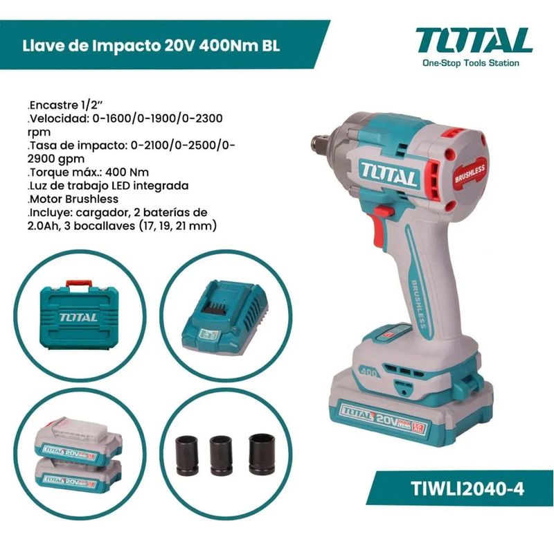 Si buscás potencia, velocidad y comodidad en un solo equipo, la Llave de Impacto Total TIWLI2040-4 es tu mejor aliada. Con su motor de 20V y un torque máximo de 400Nm, está diseñada para aflojar y ajustar tuercas y pernos con total facilidad, ideal para uso profesional, mecánico o industrial.