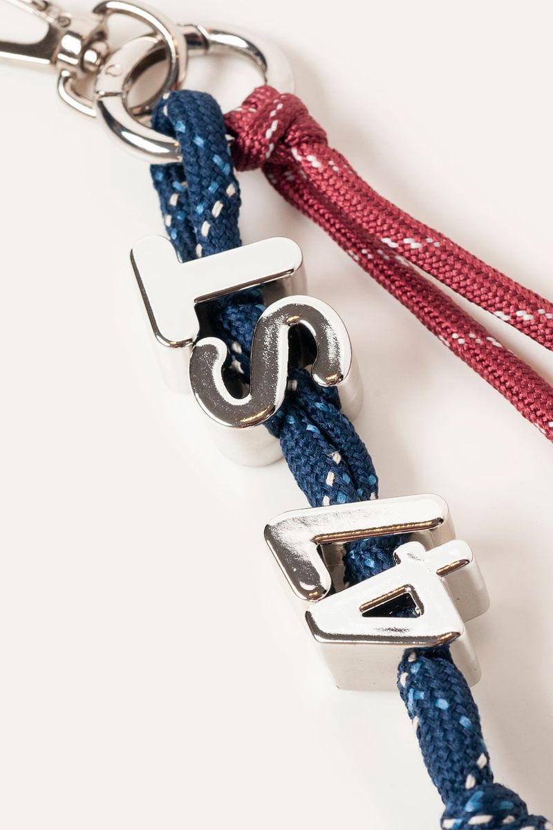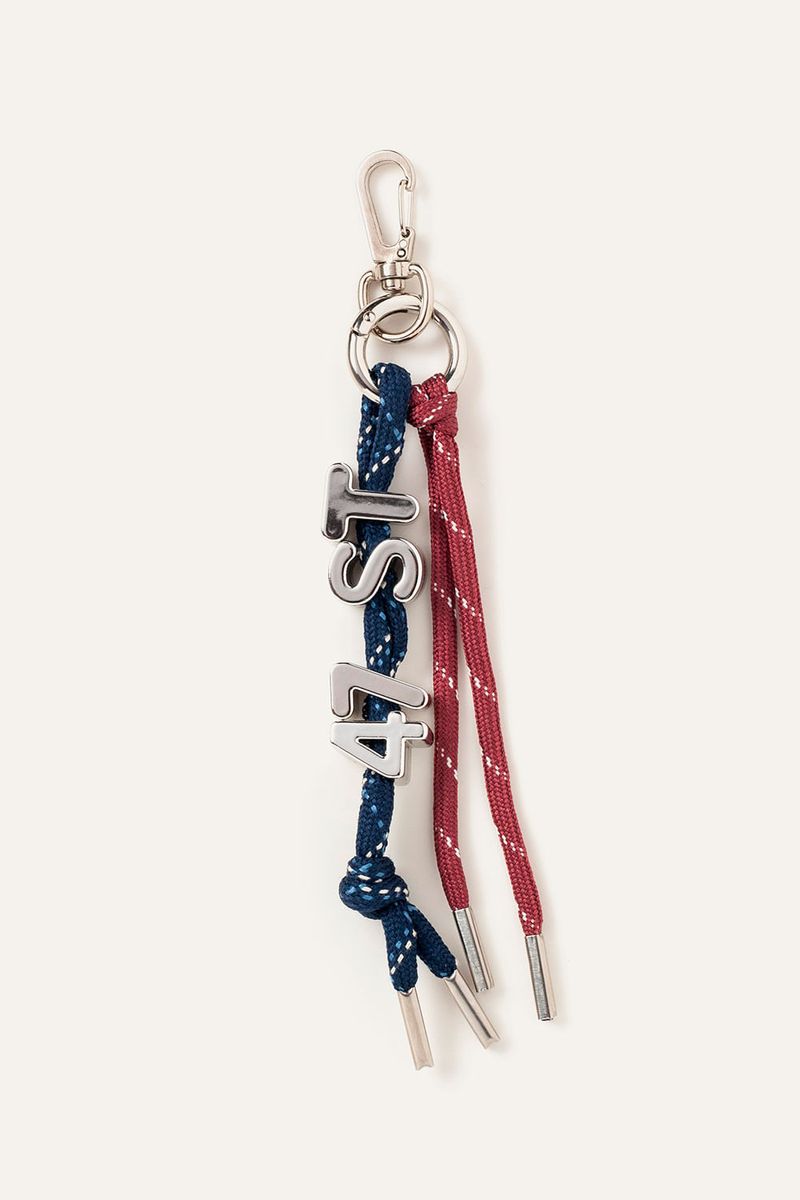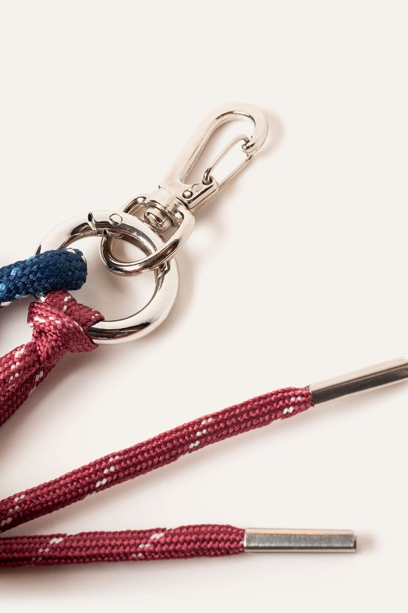 Llavero de cordones con charms metálicos y logo grabado, con doble mosquetón para colgar en mochila o bolso. Perfecto para complementar un look urbano con campera oversize y jean cargo.