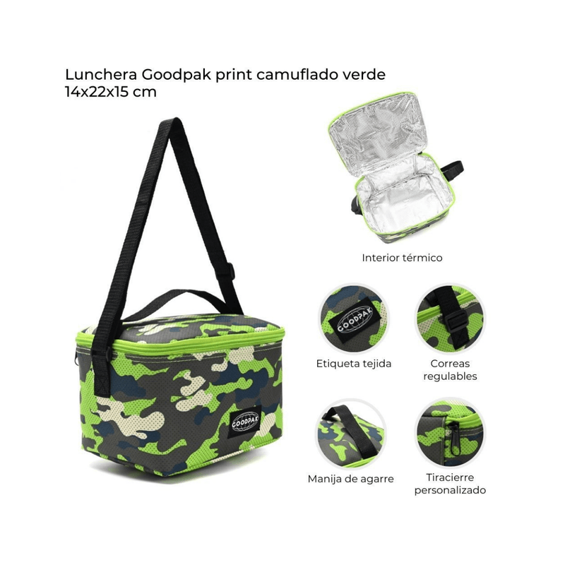 La Lunchera Goodpak Print combina diseño camo con funcionalidad. Está confeccionada en cordura resistente y cuenta con interior térmico que ayuda a conservar la temperatura de los alimentos por más tiempo.