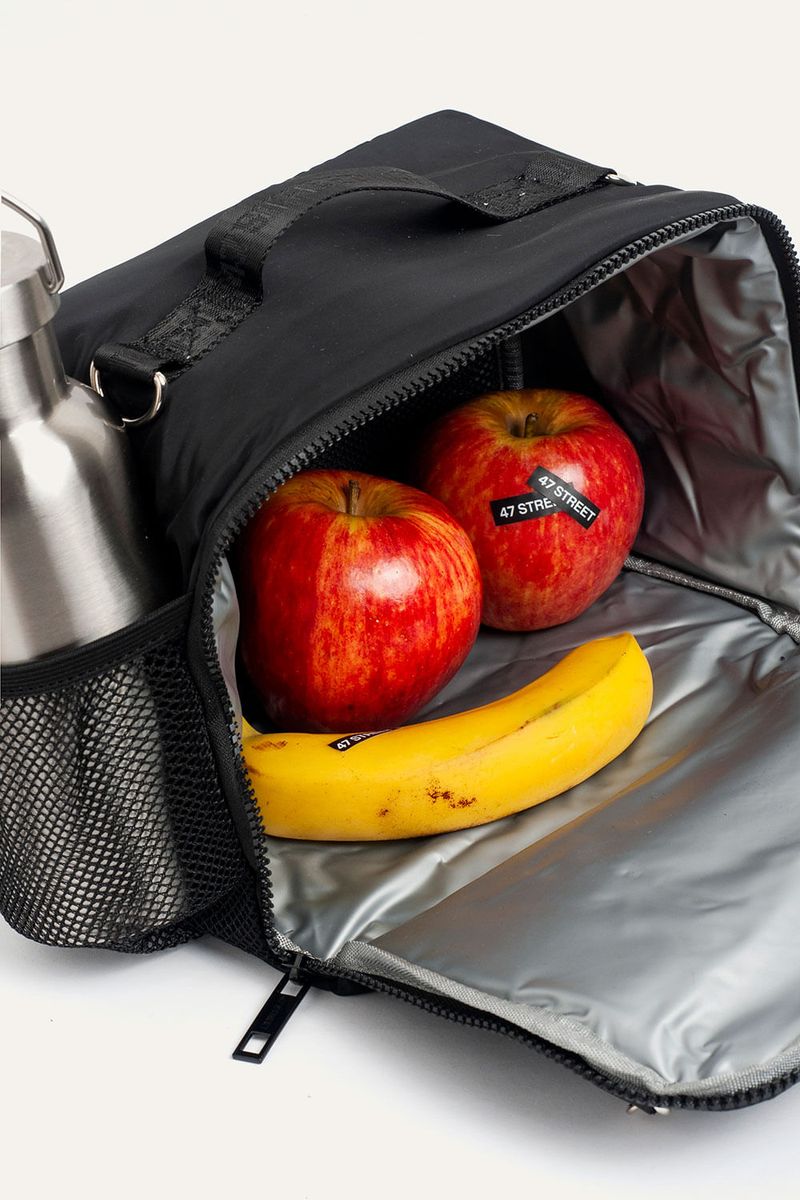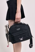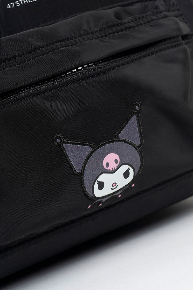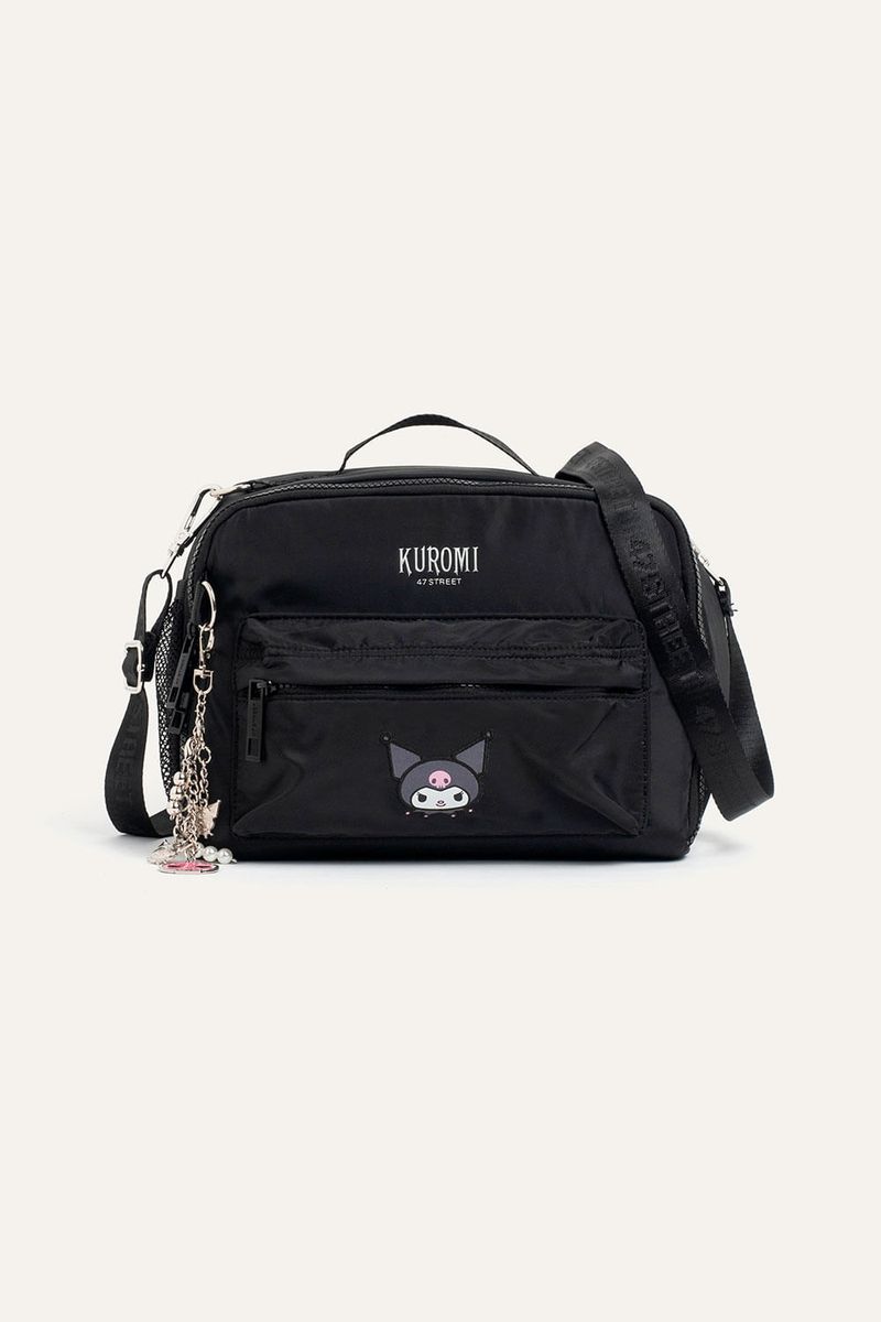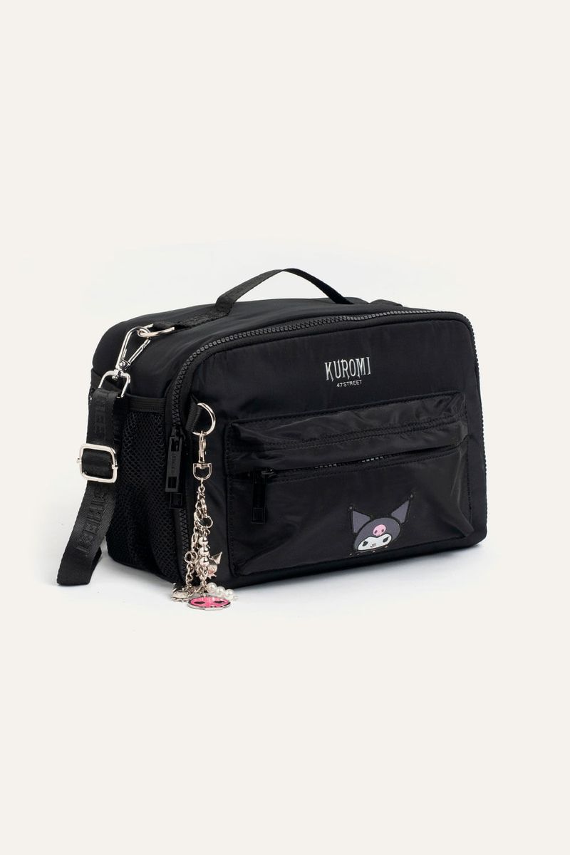 Lunchera con estampa de Kuromi y interior con material térmico, ideal para mantener alimentos a temperatura. Cuenta con bolsillo de red lateral para botella, llavero extraíble de cadena con charms de Kuromi y correa extraíble personalizada con logo de 47 Street. Incluye además un bolsillo delantero. Confeccionada en nylon, material repelente al agua y de fácil limpieza. Producto con licencia oficial de Sanrio.
