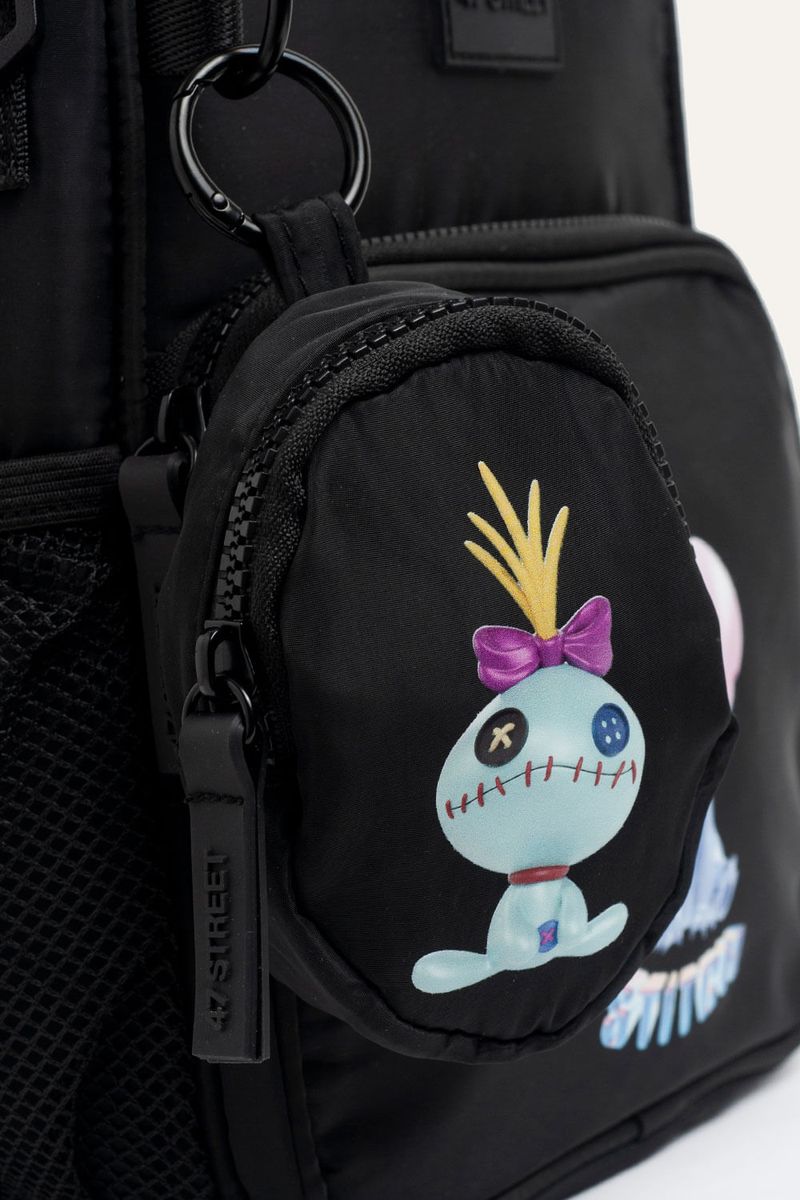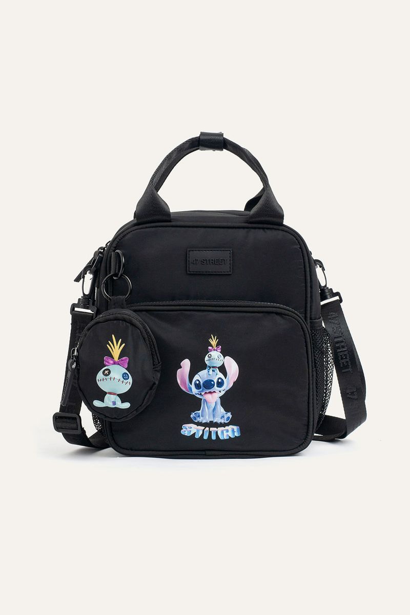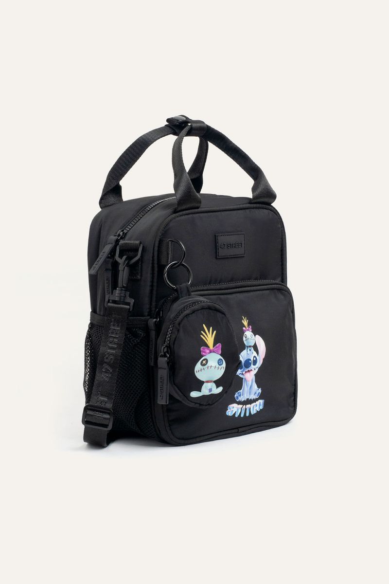 Lunchera con estampa de Stitch y interior con material térmico, pensada para el uso diario. Cuenta con bolsillo delantero y bolsillos laterales de red para botella. Incluye correa extraíble que permite usarla como mochila o bandolera y un monedero extraíble con estampa de Scrump que suma un detalle distintivo. Confeccionada en nylon, material resistente, repelente al agua y de fácil limpieza. Producto con licencia oficial de Disney.