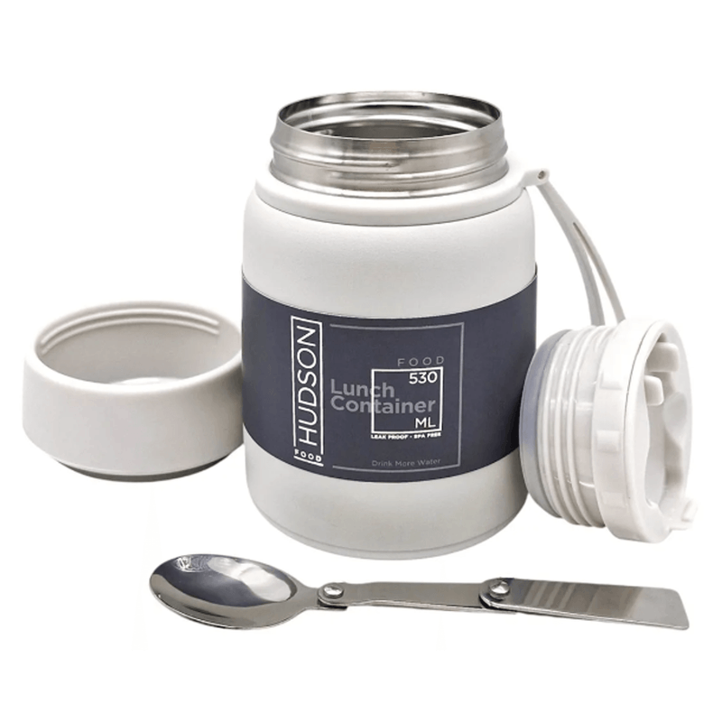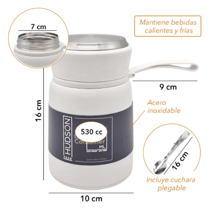 Lunchera vianda térmica Hudson de 530 cc, ideal para llevar tus comidas al trabajo, la escuela o actividades al aire libre. Fabricada en acero inoxidable de doble pared, ayuda a conservar la temperatura de los alimentos por más tiempo, manteniéndolos calientes o fríos según lo necesites. Cuenta con tapa hermética antiderrame, lo que la hace segura para transportar en mochilas o bolsos, y su diseño compacto la vuelve práctica y fácil de llevar. Incluye cuchara plegable de acero inoxidable, pensada para mayor comodidad sin necesidad de llevar cubiertos adicionales. Es resistente, reutilizable y libre de BPA, perfecta para porciones individuales de sopas, guisos, pastas o comidas caseras, combinando funcionalidad, durabilidad y un diseño moderno.
