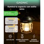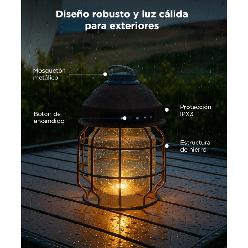 Gracias a sus baterías internas de alta capacidad (3600 mAh), este farol portátil puede iluminar durante varias horas sin necesidad de conexión eléctrica. En modo tenue alcanza hasta 15 h continuas, ideal para noches enteras de uso en exteriores, cortes de luz o espacios sin enchufes.