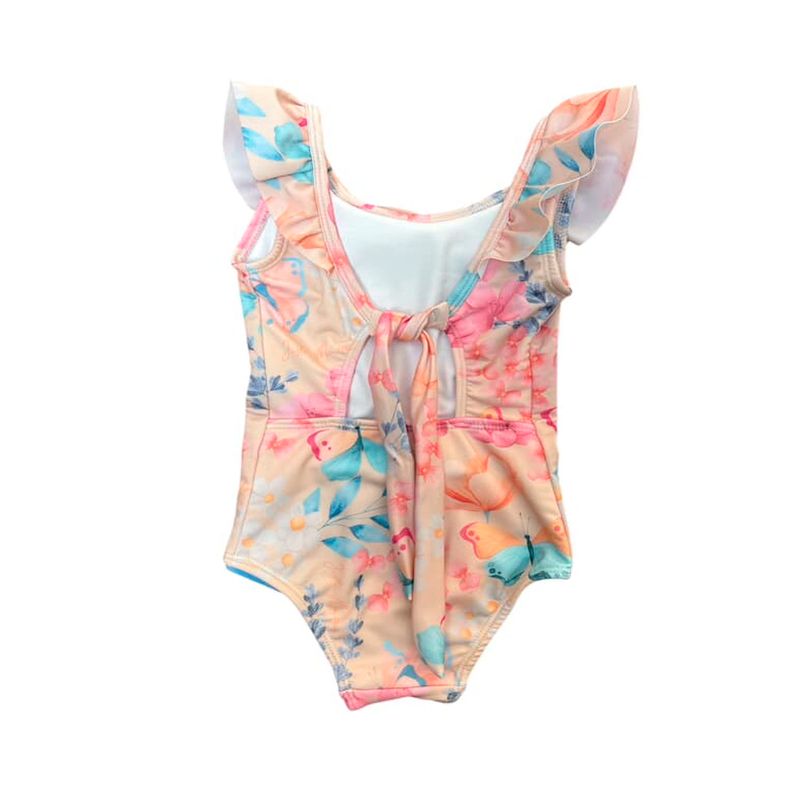Traje de baño enterizo con volados en los breteles y moños en la espalda