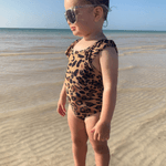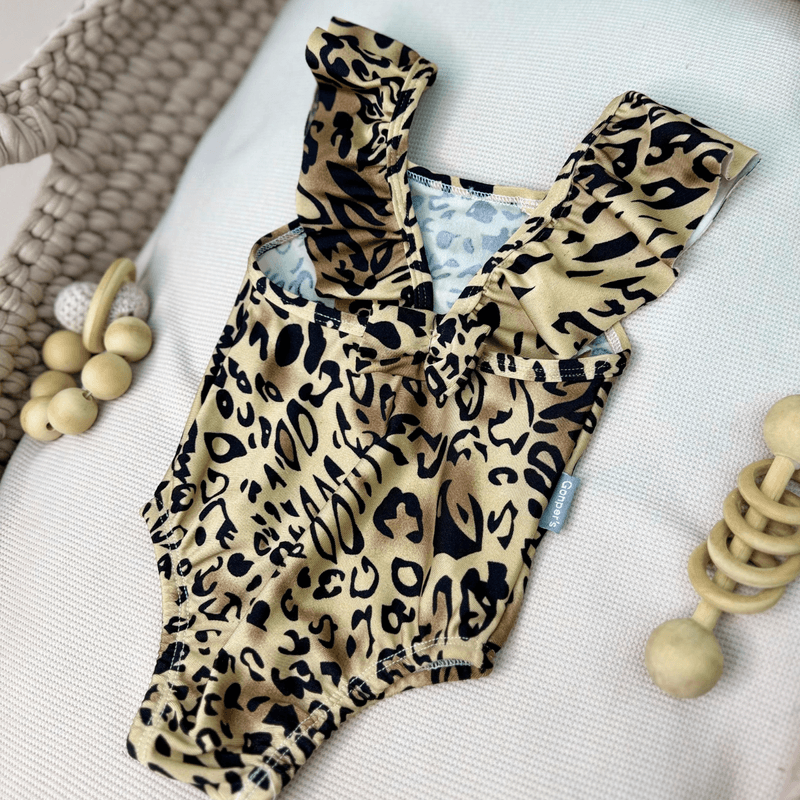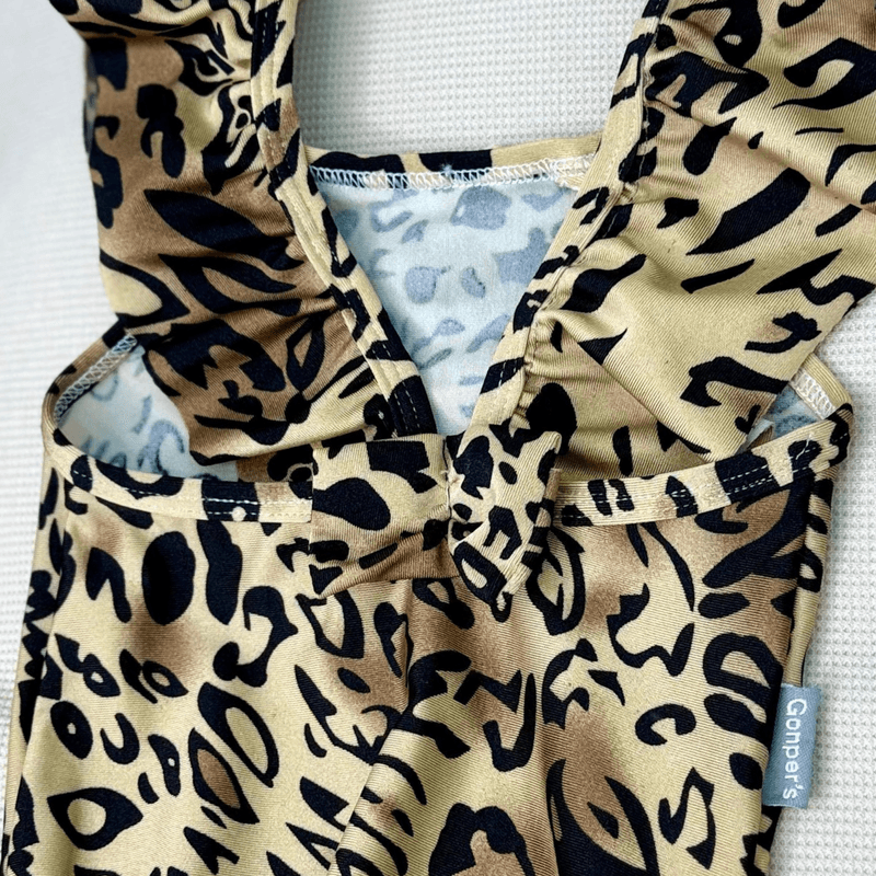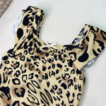 Con un estampado animal print súper actual, esta enteriza combina diseño y comodidad en cada detalle: moñito delicado al frente, manguitas con volados suaves y un moño en la espalda que corona un look único.