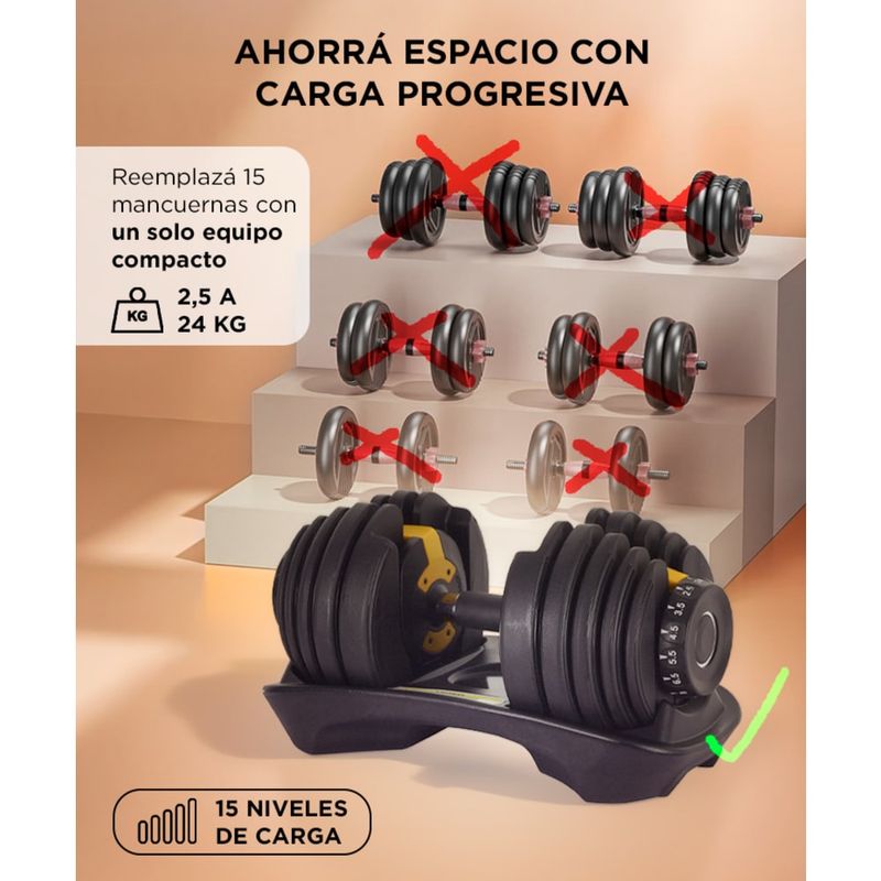 Olvidate de ocupar metros con torres de pesas. Esta mancuerna incluye base organizadora y mantiene todo ordenado.
