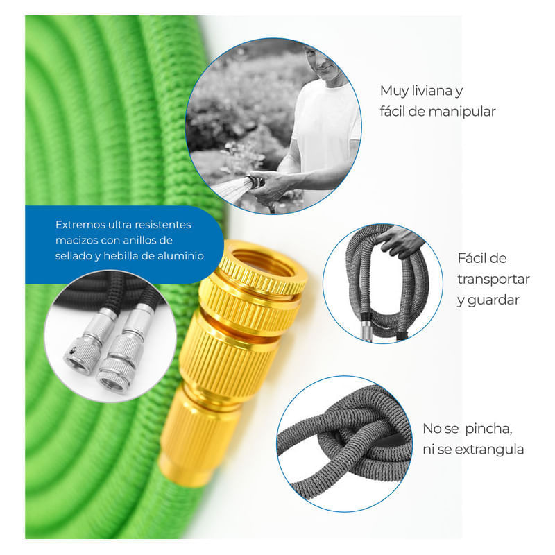 - Diseñado y fabricado exclusivamente con materiales modernos, resistentes y de alta calidad. Funcional, ligero, flexible y con la longitud suficiente para facilitar su manejo en el jardín, incluso cuando está lleno de agua.