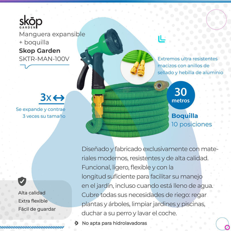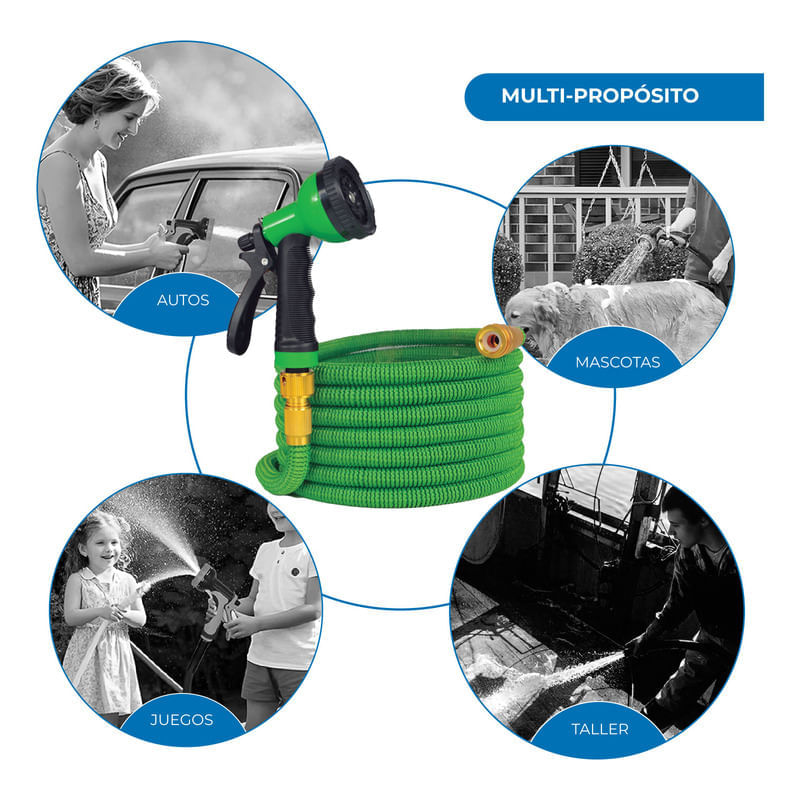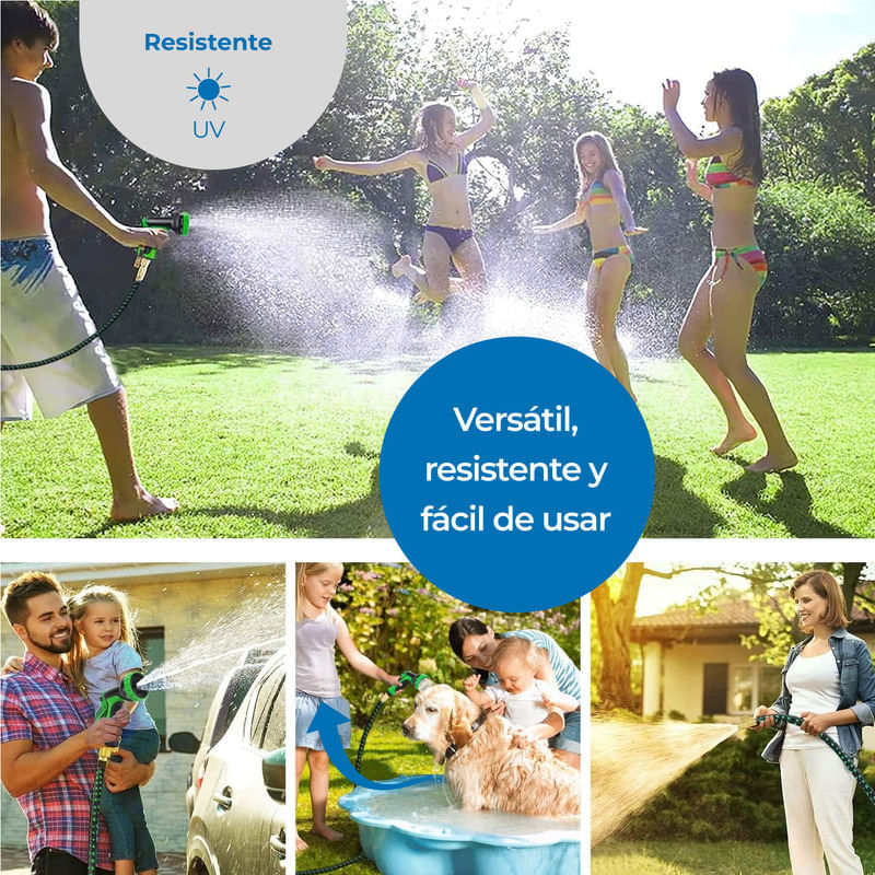 - Cubre todas sus necesidades de riego: regar plantas y árboles, limpiar jardines y piscinas, duchar a su perro y lavar el coche.