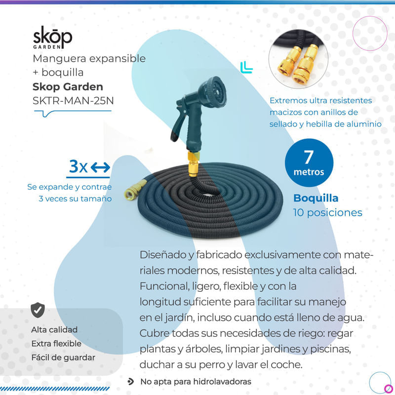 - Diseñado y fabricado exclusivamente con materiales modernos, resistentes y de alta calidad. Funcional, ligero, flexible y con la longitud suficiente para facilitar su manejo en el jardín, incluso cuando está lleno de agua.