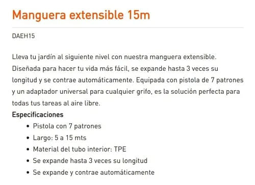MANGUERA EXTENSIBLE DAEWOO DAEH15 15M CON PISTOLA 7 PATRONES