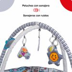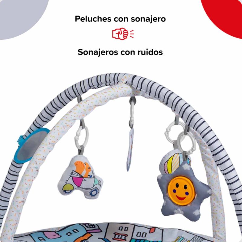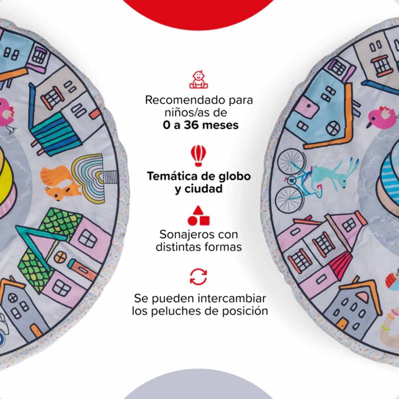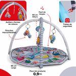 Incluye: tapete ilustrado, dos arcos desmontables, cuatro juguetes colgantes y manual de armado rápido.