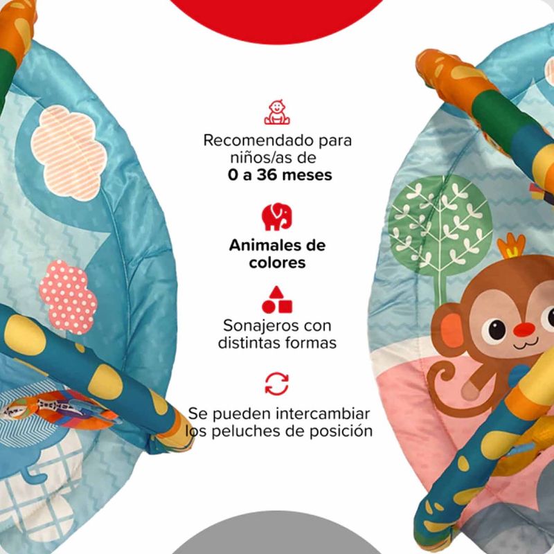 Incluye: tapete ilustrado, dos arcos desmontables, cuatro juguetes colgantes y manual de armado rápido.