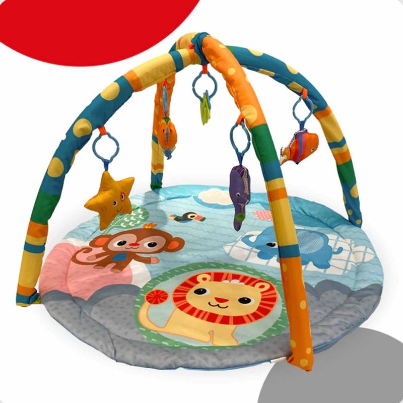Fabricado en tela poliéster suave y relleno de espuma, con arcos de plástico liviano y resistente. Juguetes de plástico y tela libre de BPA. Limpiar con un paño húmedo y detergente neutro; dejar secar al aire. No usar blanqueadores ni lavar a máquina la alfombra.