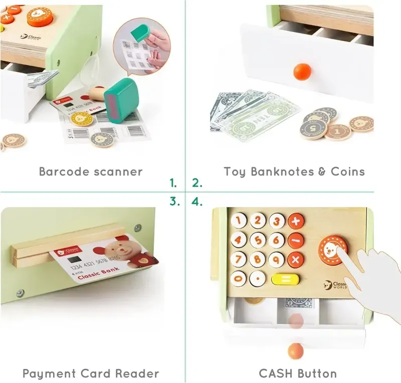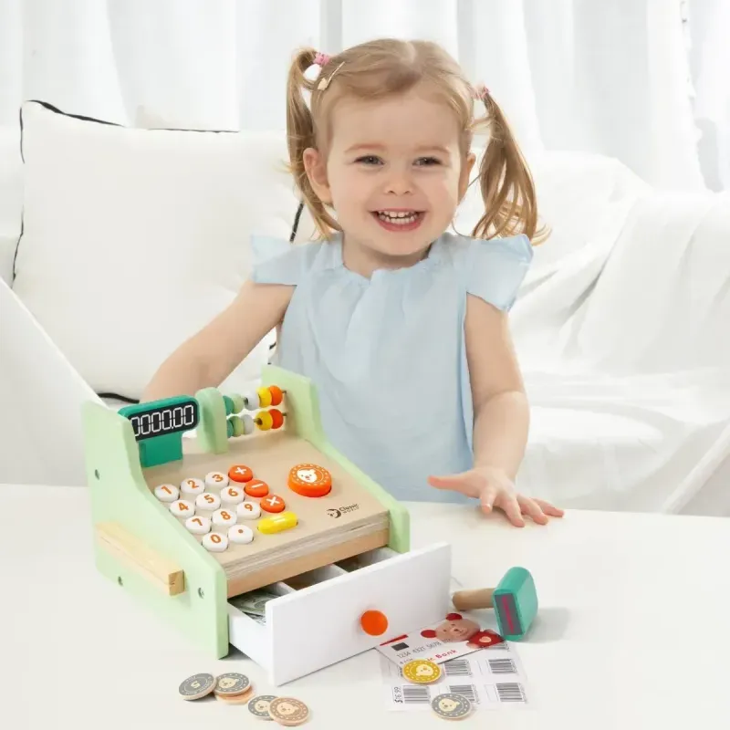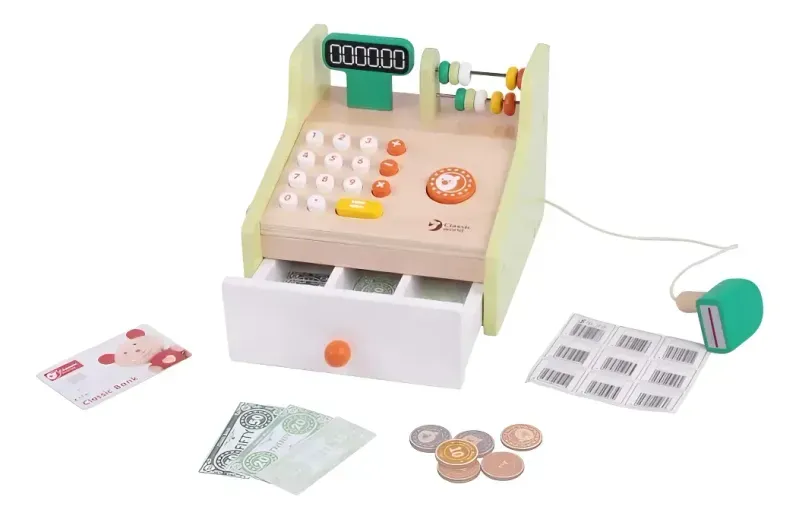¿Tarjeta o efectivo? Contar el monto total y devolver el cambio correcto será muy fácil con esta caja registradora que incluye billetes, tarjetas y monedas. Toda una fuente de diversión que les ayuda también a desarrollar sus habilidades sociales y de comunicación.