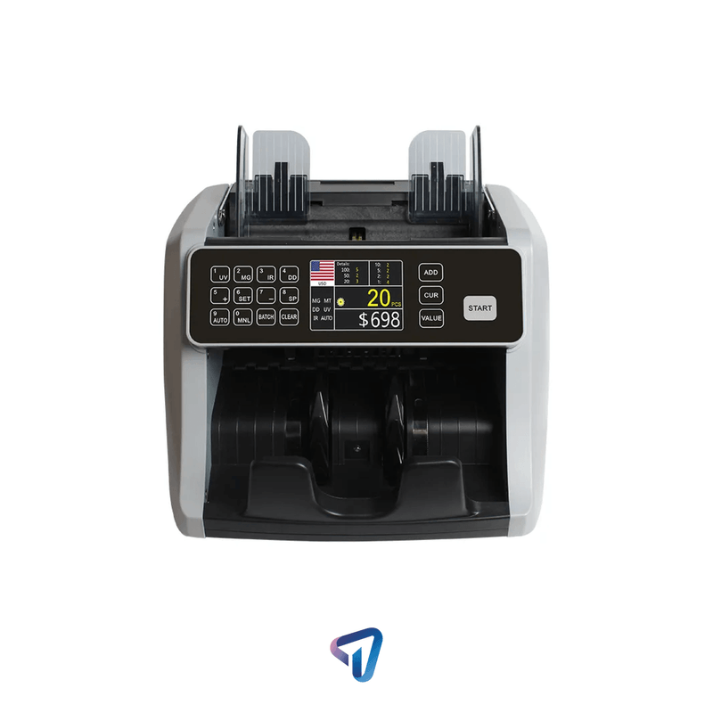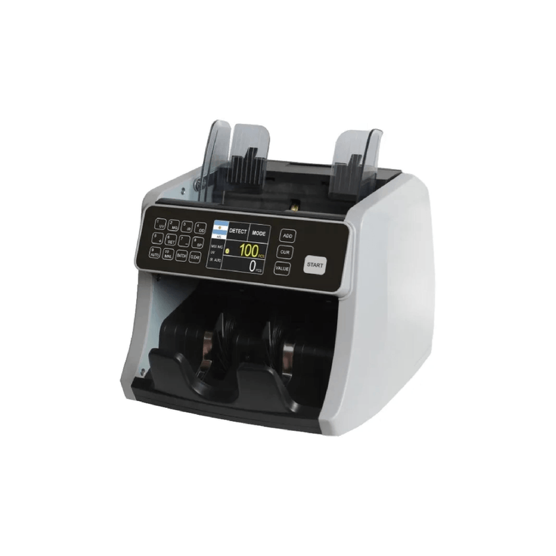 Contadora de billetes con detección UV, MG e IR, ideal para verificar autenticidad en ARS, USD y EUR. Cuenta con pantalla TFT de 2.8”, funciones automáticas de inicio, pausa y reseteo, además de modos Batch y Add. Ofrece una velocidad de conteo de hasta 1200 billetes por minuto, con capacidad de carga superior para 500 billetes y descarga para 200. Detecta billetes pegados o rotos, trabaja con alimentación de 220V y un consumo de 80W. Sus dimensiones compactas (265 x 250 x 220 mm) y peso de 4,2 kg la hacen práctica y eficiente para entornos de trabajo exigentes.