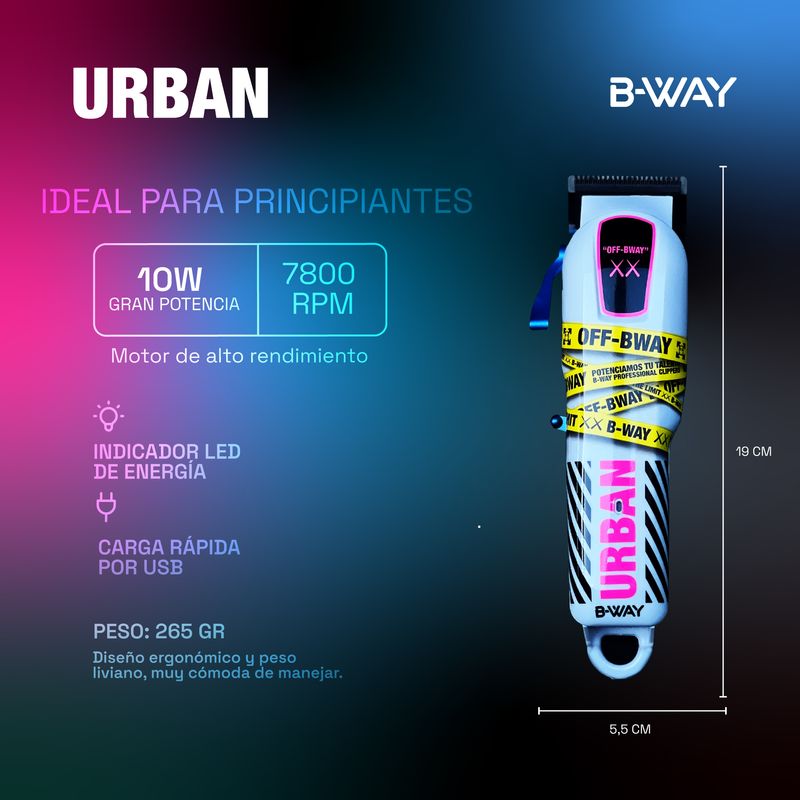 Maquina de cortar pelo profesional BWAY Urban ideal para quienes buscan su primera herramienta de calidad. Disenada para cortes de cabello y barba combina potencia precision y facilidad de uso. Cuenta con motor confiable bateria recargable de buena autonomia y diseno ergonomico que facilita el manejo. Ofrece cortes uniformes y suaves perfecta tanto para uso personal como para quienes inician en barberia. Incluye peines de distintas medidas cable de carga cepillo de limpieza y aceite lubricante. Beneficios maquina practica liviana y resistente pensada para acompanar en el dia a dia con resultados profesionales