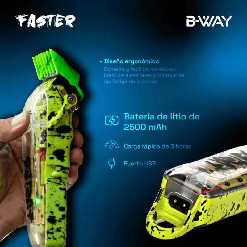 Maquina de cortar pelo profesional BWAY Faster disenada para cortes de cabello y barba con precision. Cuenta con motor potente y silencioso bateria de litio de larga duracion e indicador LED. Es liviana ergonomica y facil de limpiar. Permite cortes desde 2 mm sin peine guia y trae peines de 1 5 a 13 mm. Especificaciones peso 265 g dimensiones 19 x 5 5 cm velocidad 7800 RPM bateria 2200 mAh con hasta 4 horas de uso carga completa en 3 horas por USB 5V potencia 12 W cuchilla fija concava de grafito uso inalambrico y cabezal lavable. Incluye maquina 6 peines cable USB cepillo de limpieza aceite lubricante y peine de velocidad. Beneficios alta precision cuchillas ajustables bateria recargable y diseno practico para uso profesional o personal