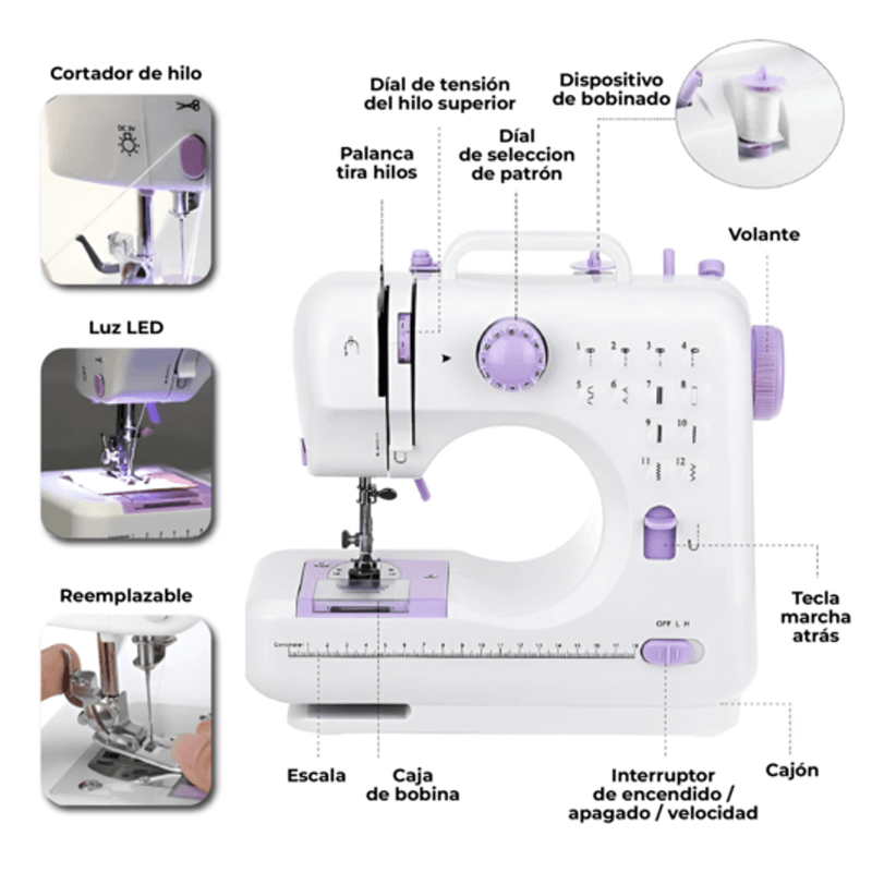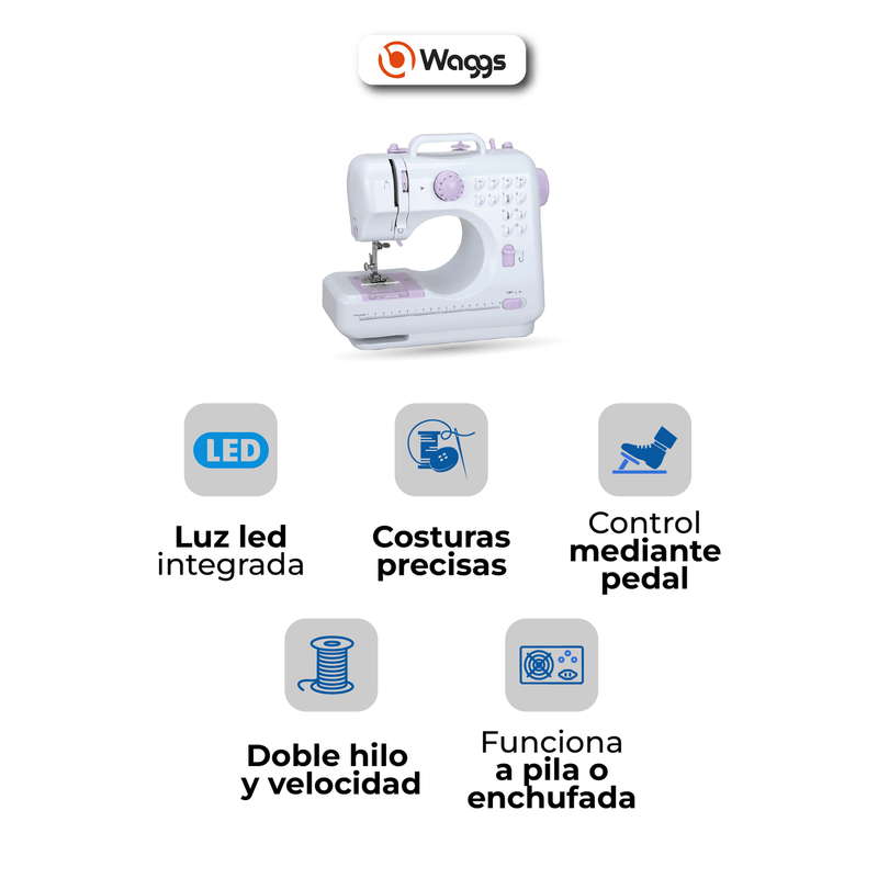 La máquina de coser portátil WAGGS MAQC01 combina funcionalidad, portabilidad y precisión para que puedas confeccionar, reparar o crear desde cualquier lugar. Con 12 puntadas integradas, doble velocidad y opción de alimentación por adaptador o pilas, se adapta a todo tipo de proyectos domésticos o de costura ligera. Su luz LED incorporada mejora la visibilidad, mientras que el cortador de hilo, el cajón de accesorios y el brazo libre aportan comodidad y practicidad. Compacta, versátil y fácil de usar, la WAGGS MAQC01 transforma tu espacio en un taller creativo donde cada puntada refleja tu estilo.