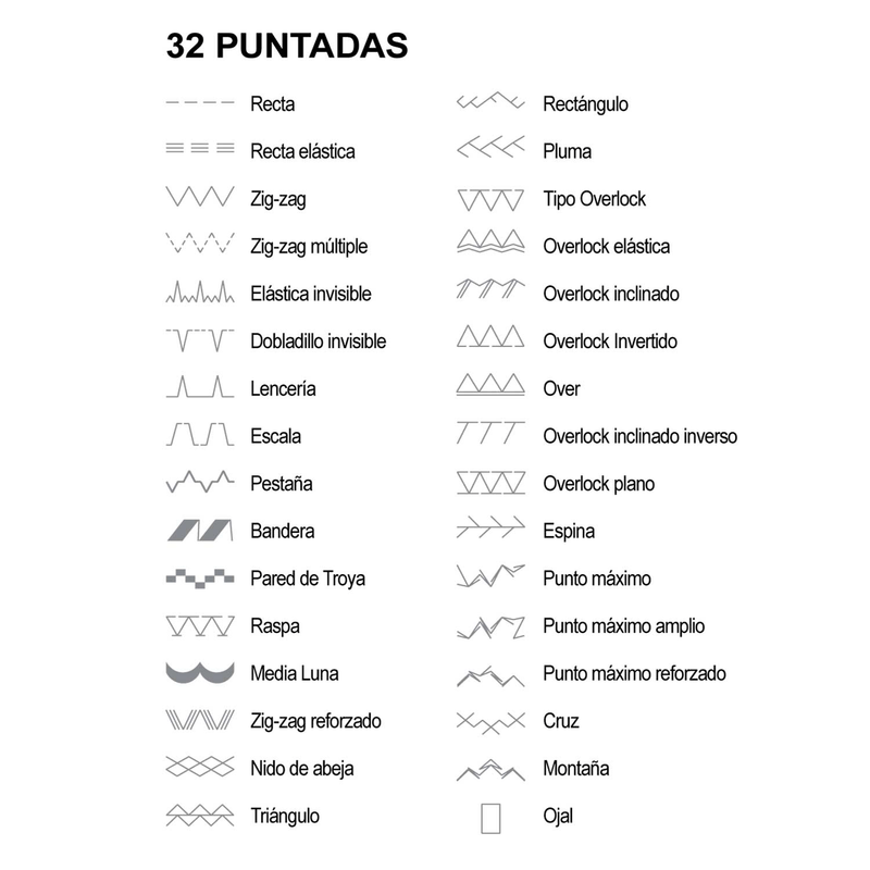 Incluye 32 puntadas de costura con largo y ancho de puntada ajustable para trabajar en todo tipo de tejidos: rígidos y elásticos.