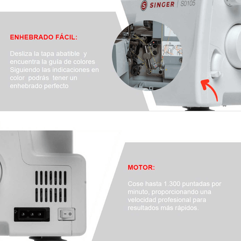 • Guía de fácil enhebrado - Indica por medio de colores los pasos a seguir para enhebrar los