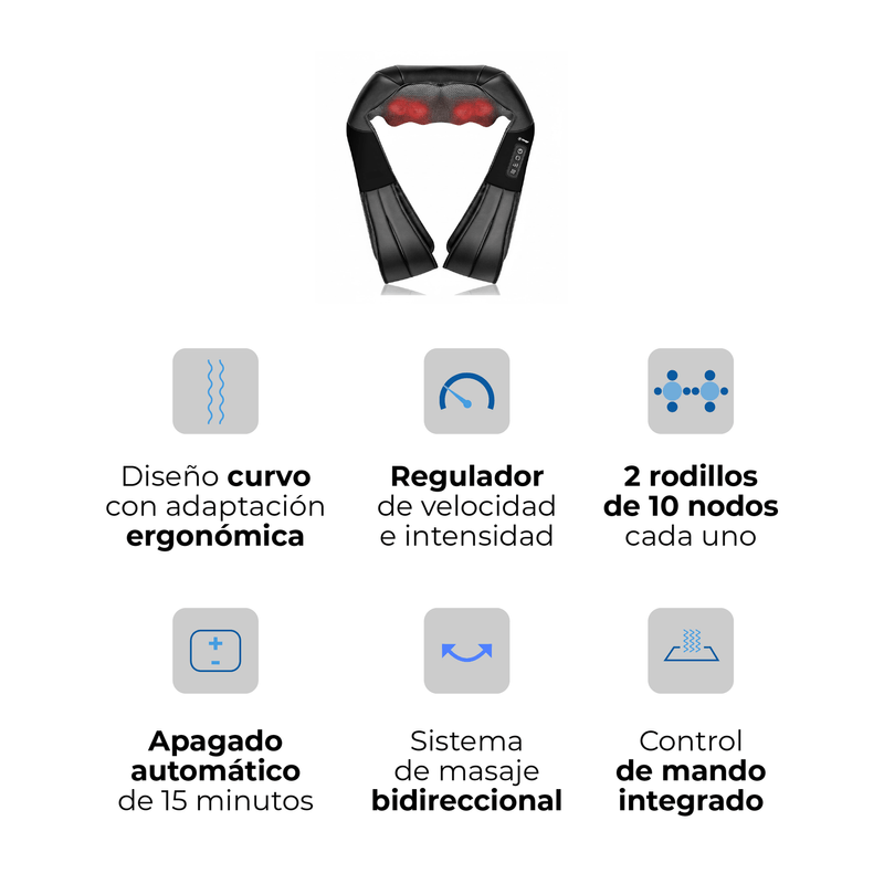 El Masajeador Waggs CM001 es el aliado perfecto para una rutina diaria de relajación y bienestar, gracias a su diseño ergonómico y tecnología avanzada que incorpora la técnica japonesa Shiatsu, conocida por aliviar tensiones musculares, mejorar la circulación y promover un estado de equilibrio en el cuerpo. Este masajeador versátil es ideal para cualquier momento del día: se puede usar mientras trabajas, durante un descanso en casa o mientras viajas en auto, gracias a su conector de corriente de 12V. Su portabilidad permite disfrutar de un masaje profundo y reconfortante en el cuello, hombros y otras áreas del cuerpo, y cuenta con funciones adicionales como calor terapéutico que potencia los beneficios del masaje, además de un sistema intuitivo de control para ajustar la intensidad y personalizar la experiencia de relajación.