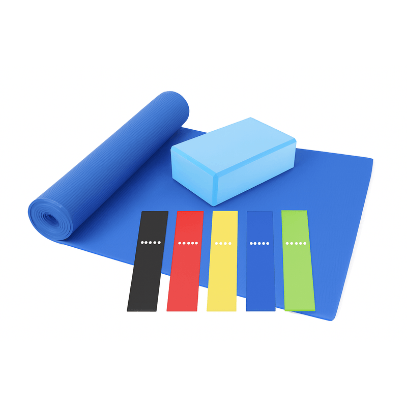Mat colchoneta yoga pilates PVC 4 mm + Ladrillo yoga + 5 bandas elásticas
