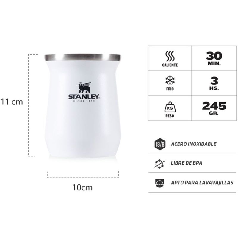 MATE 236ML STANLEY -Capacidad 236ml -Es un accesorio icónico que ha demostrado ser práctico y fácil de limpiar, además de mantener la temperatura durante toda la cebada. Este producto es muy popular en Argentina debido a su capacidad de mantener la temperatura caliente durante 30 minutos y fría durante 3 horas, lo que lo convierte en un elemento indispensable para los amantes del mate. Con el Mate Stanley 236 ml, no tendrás que preocuparte por sabores defectuosos, ya que es inocuo y no transfiere ningún aroma ni sabor -Diseño elegante y funcional, con un peso de 245 gramos, una altura de 11 cm y un diámetro de 8 cm, lo convierte en un accesorio fácil de transportar y usar en cualquier momento -La Serie Classic del Mate Stanley 236 ml está hecha de acero inoxidable 18/8, lo que significa que es naturalmente libre de Bisfenol (BPA) y no se oxida. Con su aislamiento al vacío de doble pared y su diseño a prueba de fugas, este mate es el compañero perfecto para cualquier amante del mate en Argentina. Es apto para el lavavajillas, lo que lohace muy fácil de limpiar y mantener - Modelo MATE STANLEY - Origen China.