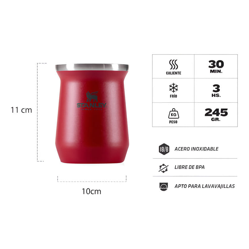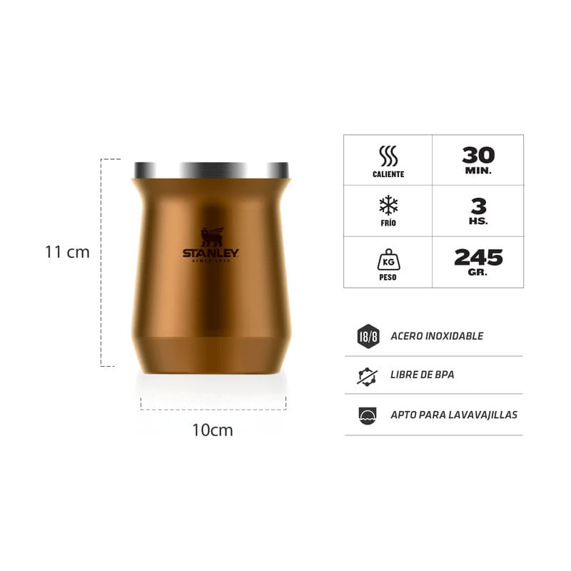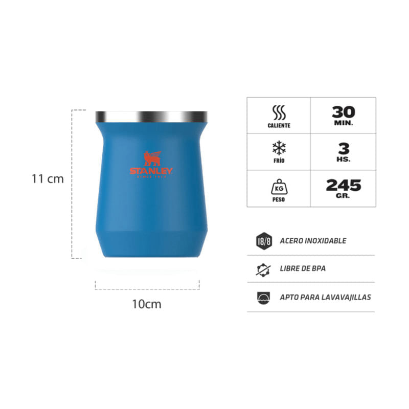 El mate Stanley mantiene la temperatura durante toda la cebada. Es práctico e higiénico, posee una apertura de boca ancha para facilitar el llenado y la limpieza. Se adapta perfecto al bolsillo trasero. Tapa de acero mecanizado, para mayor durabilidad